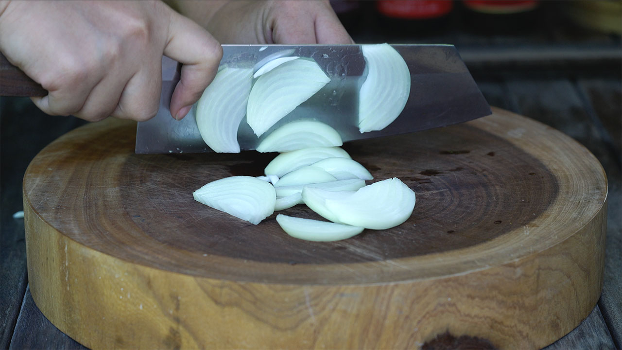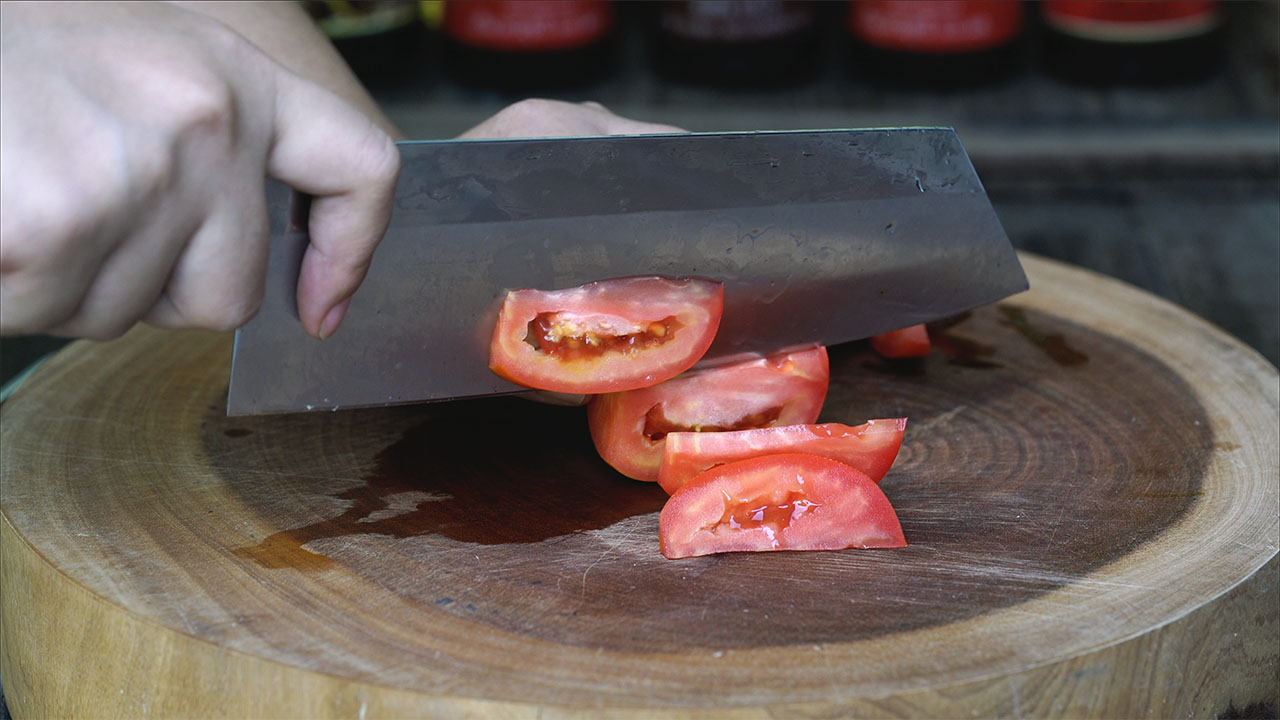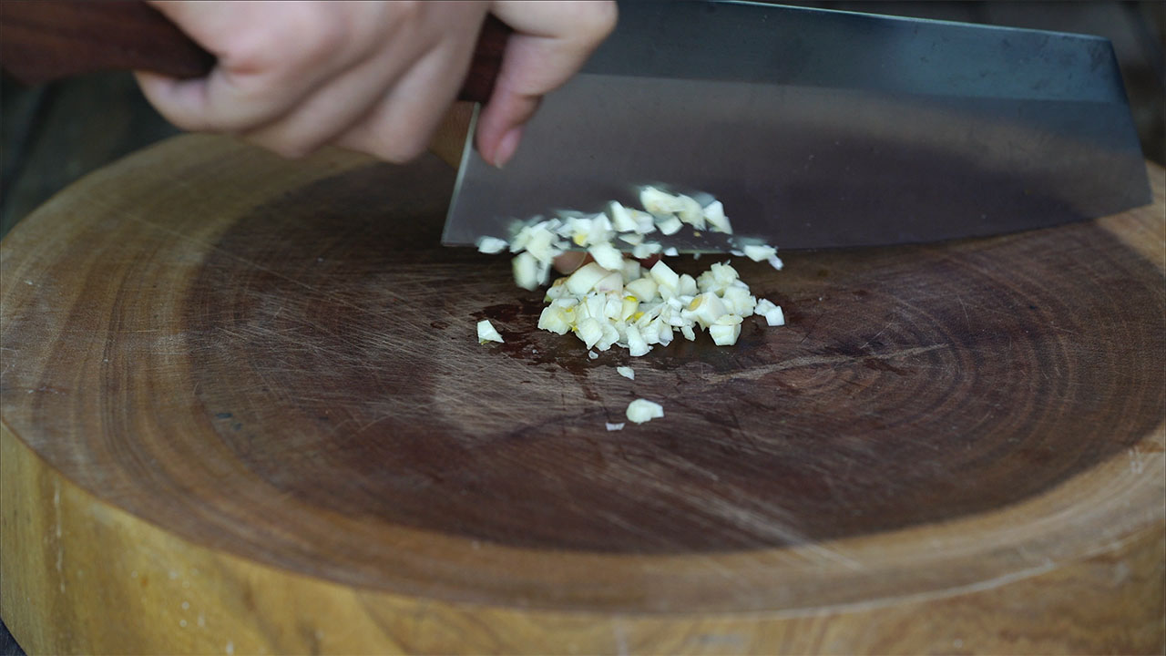 a) Picar los ajos. Quitar la parte más dura del tallo del brócoli chino y cortar en trozos de unos 3 centímetros, cortar la cebolla en juliana, el tomate en gajos de un bocado.