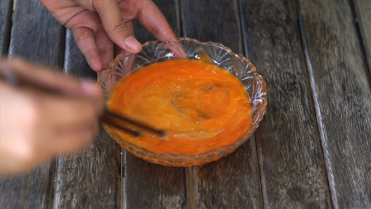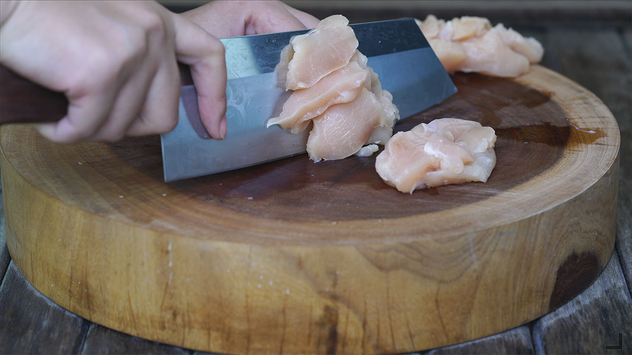 b) Cortar la pechuga de pollo en trozos. En un recipiente batir los huevos y reservar para luego.