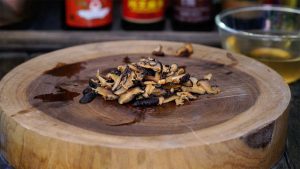 a) Poner las setas Shiitake a hidratar unos 30 y cortarlas en juliana.