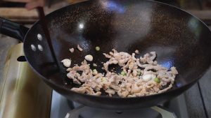 b) Cortar la zanahoria, los brotes de bambú, la panceta de cerdo y el tofú en juliana.