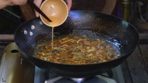a) Añadir la salsa de soja, saltear todo junto. Agregar el agua y dejar hervir.
