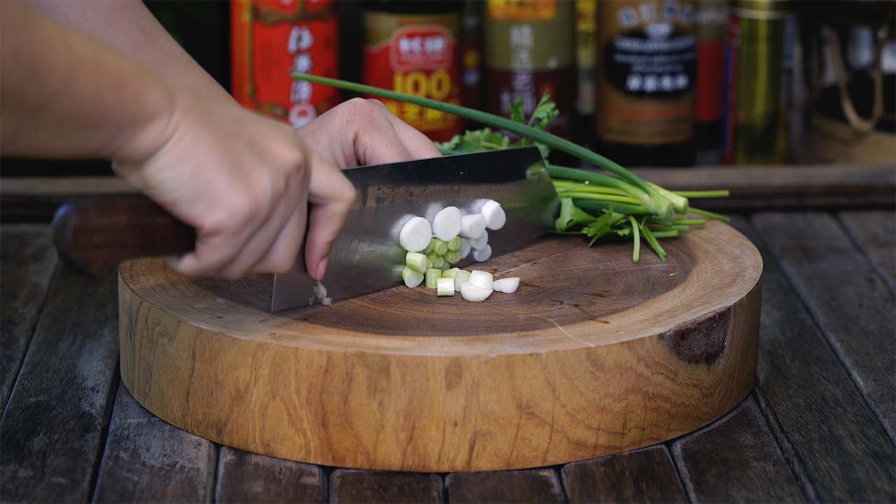 c) Separar la parte más blanca de la cebolleta, cortarla en trozos pequeños. Picar la parte verde de la cebolleta junto con el cilantro.