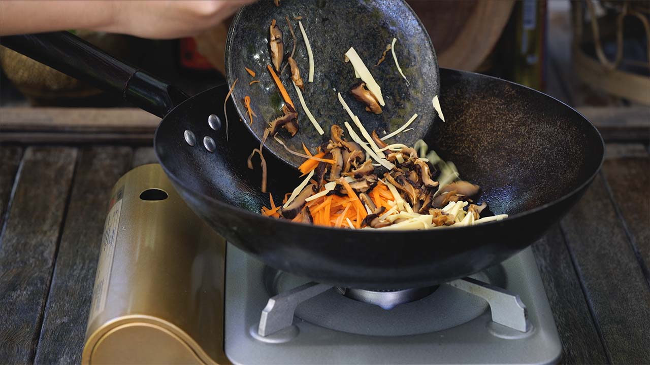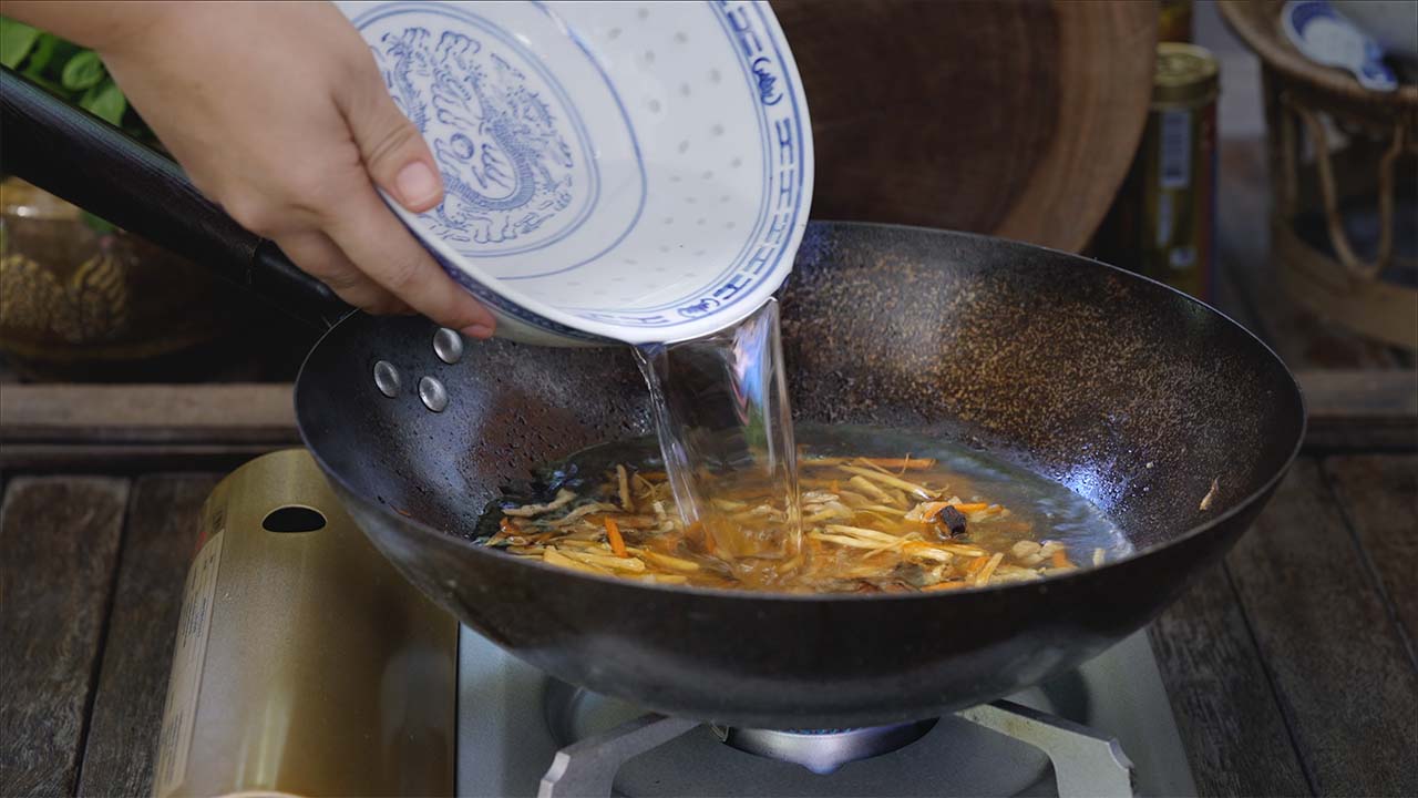 b) Agregar la zanahoria, el bambú, las setas y remover bien.