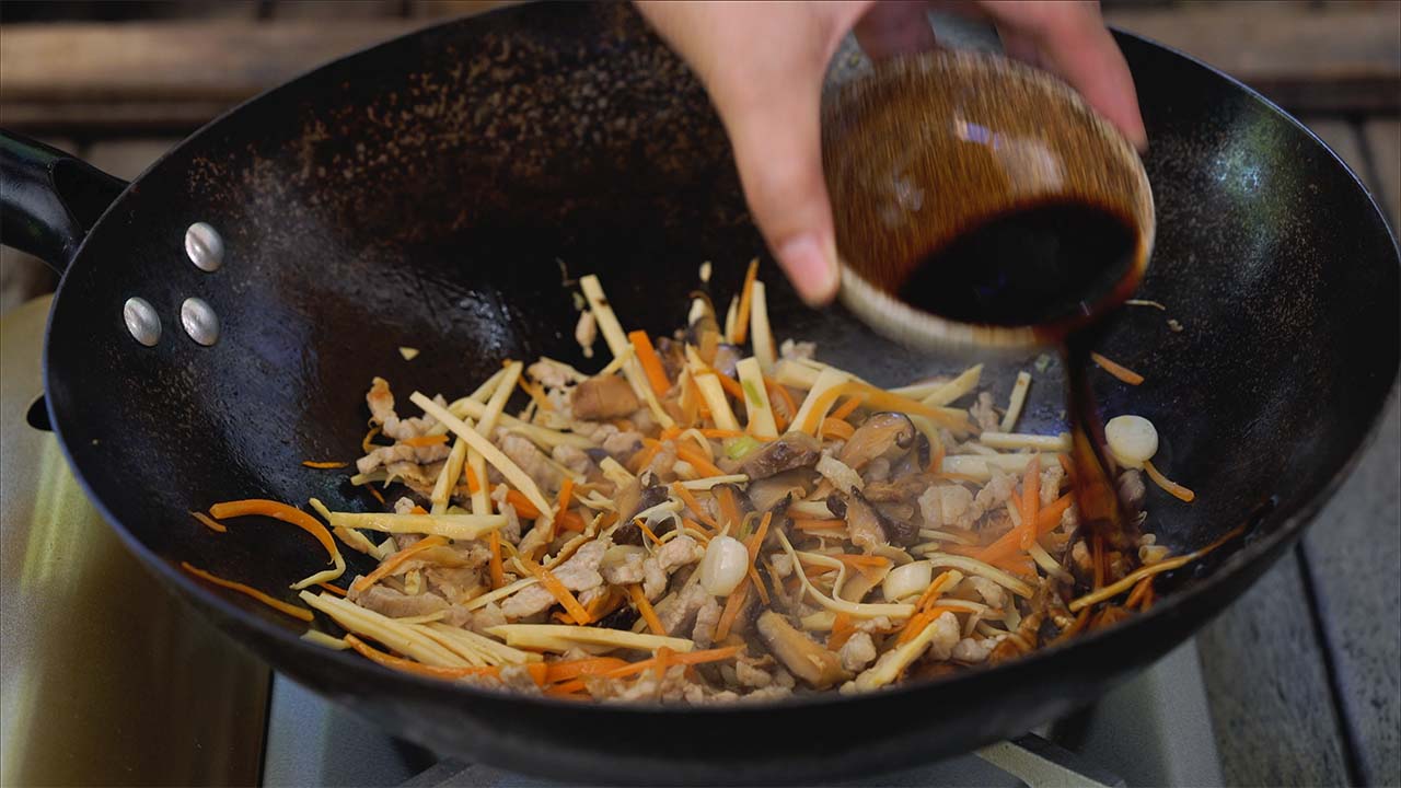 b) Cortar la zanahoria, los brotes de bambú, la panceta de cerdo y el tofú en juliana.