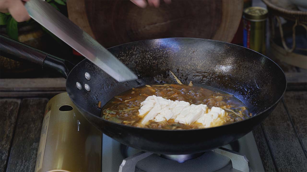 c) Añadir el tofu, remover con mucho cuidado y dejar cocinar. finalmente en un bol batir el huevo y agregar a la sopa poco a poco haciendo hilos. remover un par de vueltas y listo para servir.