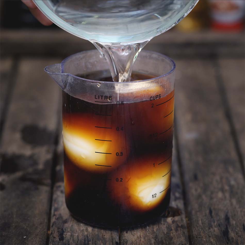 - Los pasamos al agua con hielo para detener la cocción, cuando estén enfriados, los pelamos y ponemos en un recipiente. Añadimos salsa de soja y agua hasta cubrirlos. Reservamos en la nevera y mientras, preparamos el resto de ingredientes.