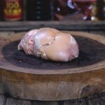 - Apilamos el pollo uno encima del otro. Enrollamos y con hilo de cocina lo atamos bien para que mantenga su forma.