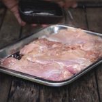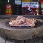- Preparar el pollo: quitamos la piel del contramuslo de pollo, reservando la piel para preparar el aceite aromático y salpimentamos por ambos lados.