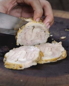 - Retiramos el pollo de la olla y cuando se haya enfriado un poco, quitamos el hilo y lo cortamos en rodajas.