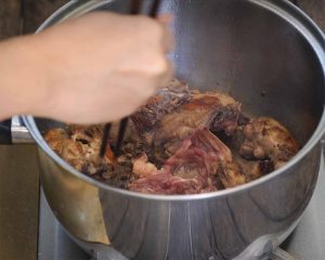 - En una olla ponemos un poco de aceite y sellamos el pollo, cuando esté dorado, retiramos del fuego y ponemos los huesos a dorar.