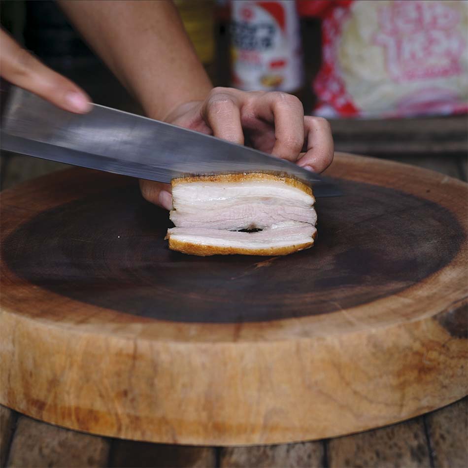 b) Cortar la panceta en trozos, para ayudar a que se cocine más rápido, pero tampoco tan fina ya que luego va a ser difícil de cortar.