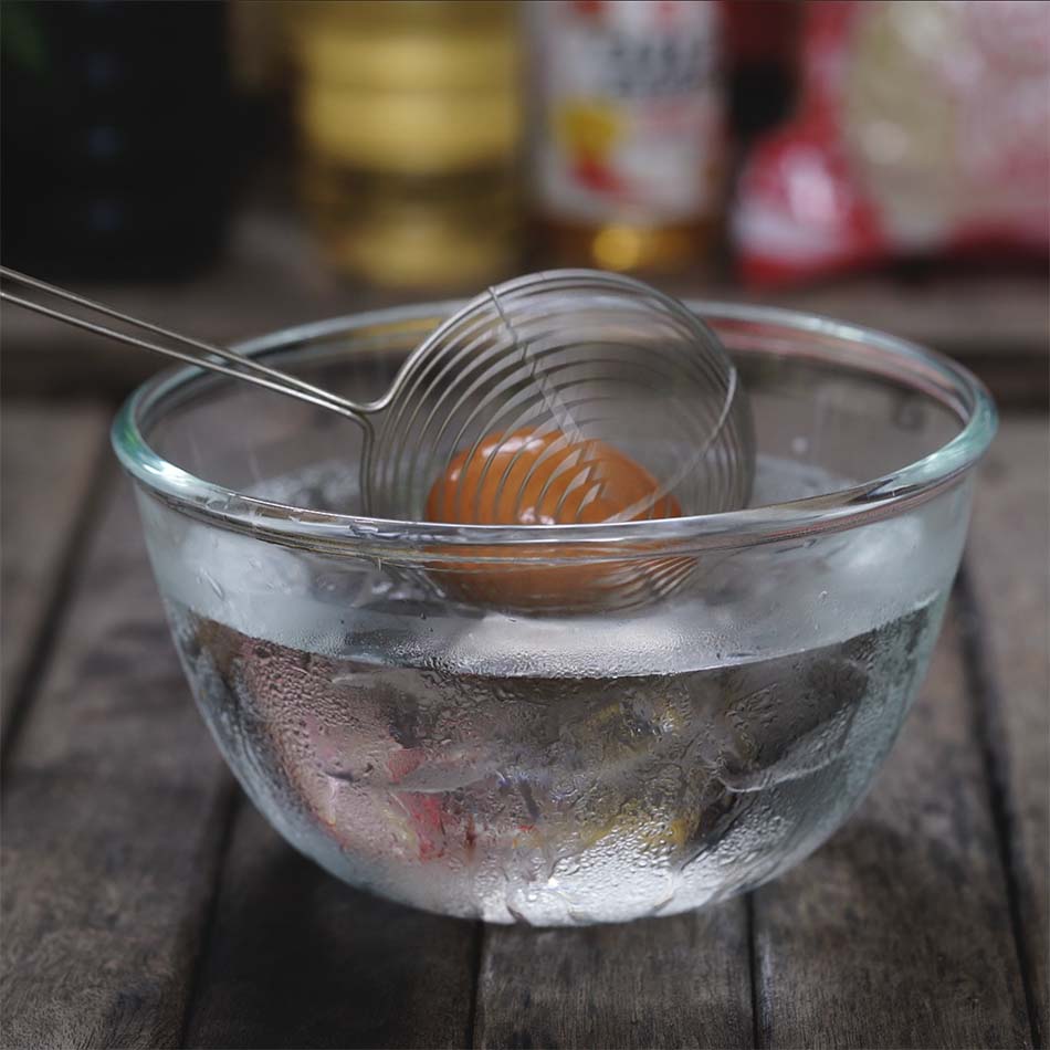- Sacar a agua con hielo para detener la cocción, cuando estén enfriados, pelalos y ponemos en un recipiente. Añadir la salsa de soja y el agua hasta cubrirlos. Reservar en la nevera.