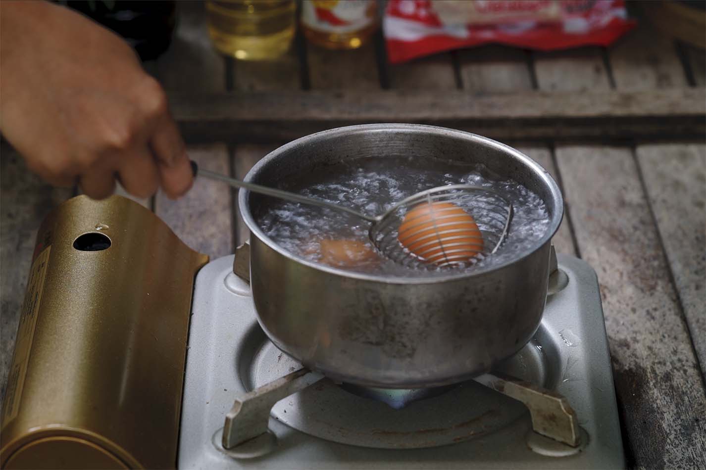 - Poner los huevos que tienen que estar a temperatura ambiente a cocinar en agua hirviendo durante 5 minutos, el primer minuto vamos moviendo continuamente para que la yema se quede en el centro.